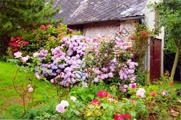 Now start to show your dark shapes from your value study. To build up the flowers, add another darker value to show a shadow side. Divide up the shape into smaller shapes with value and dark shapes. When the roof is dry, show line work which will give the roof some texture. Also show some line work in the flower stems and grasses.